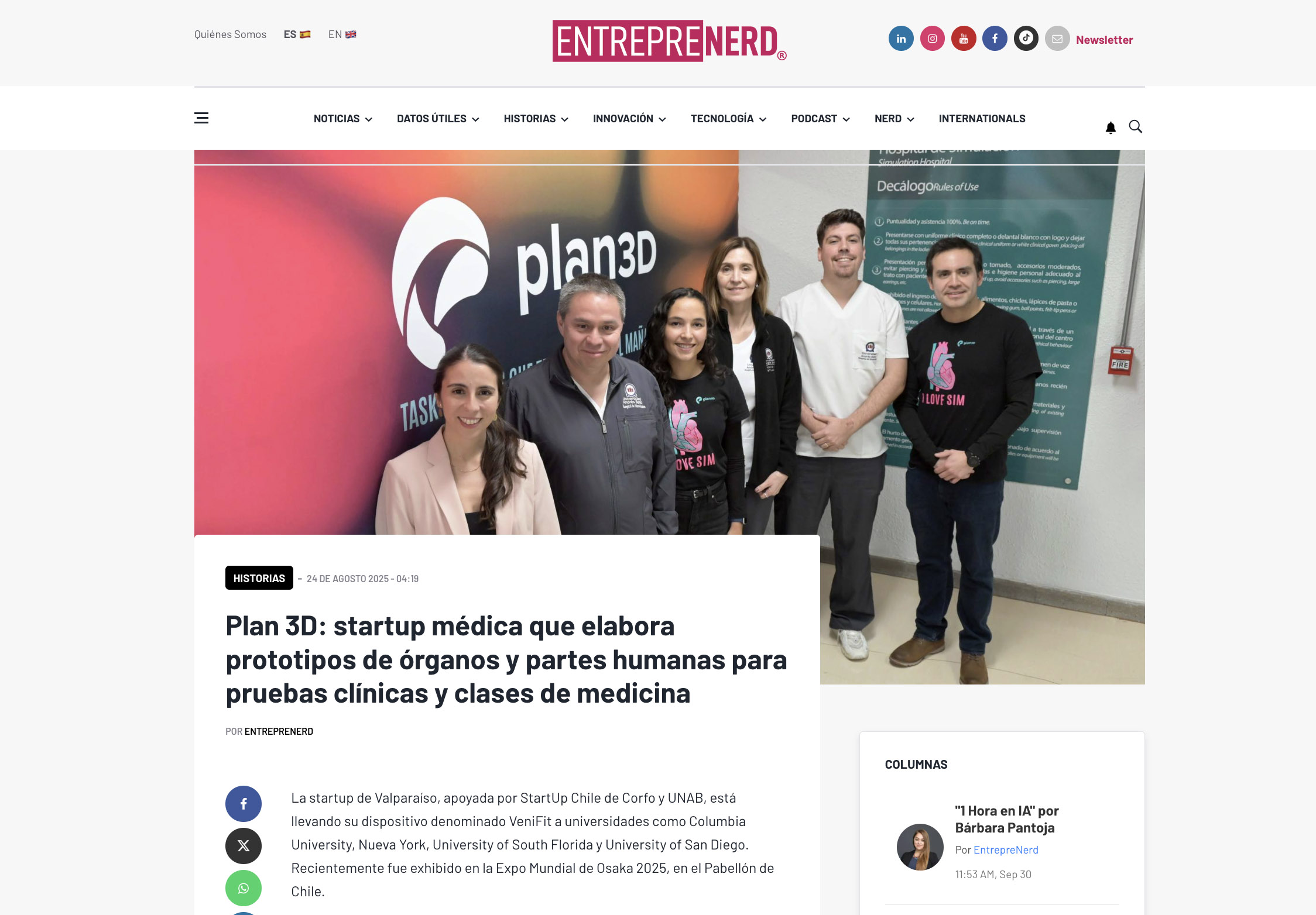 En Descubre.vc, la publicación “Plan 3D expande simuladores médicos a universidades globales” destacó la participación de la empresa en la Expo Mundial Osaka 2025, donde presentó su dispositivo VeniFit, validado junto a la Universidad Andrés Bello. El artículo pone énfasis en la calidad técnica del simulador —más de 2.400 punciones, realismo táctil y reflujo sanguíneo— y su alcance internacional.