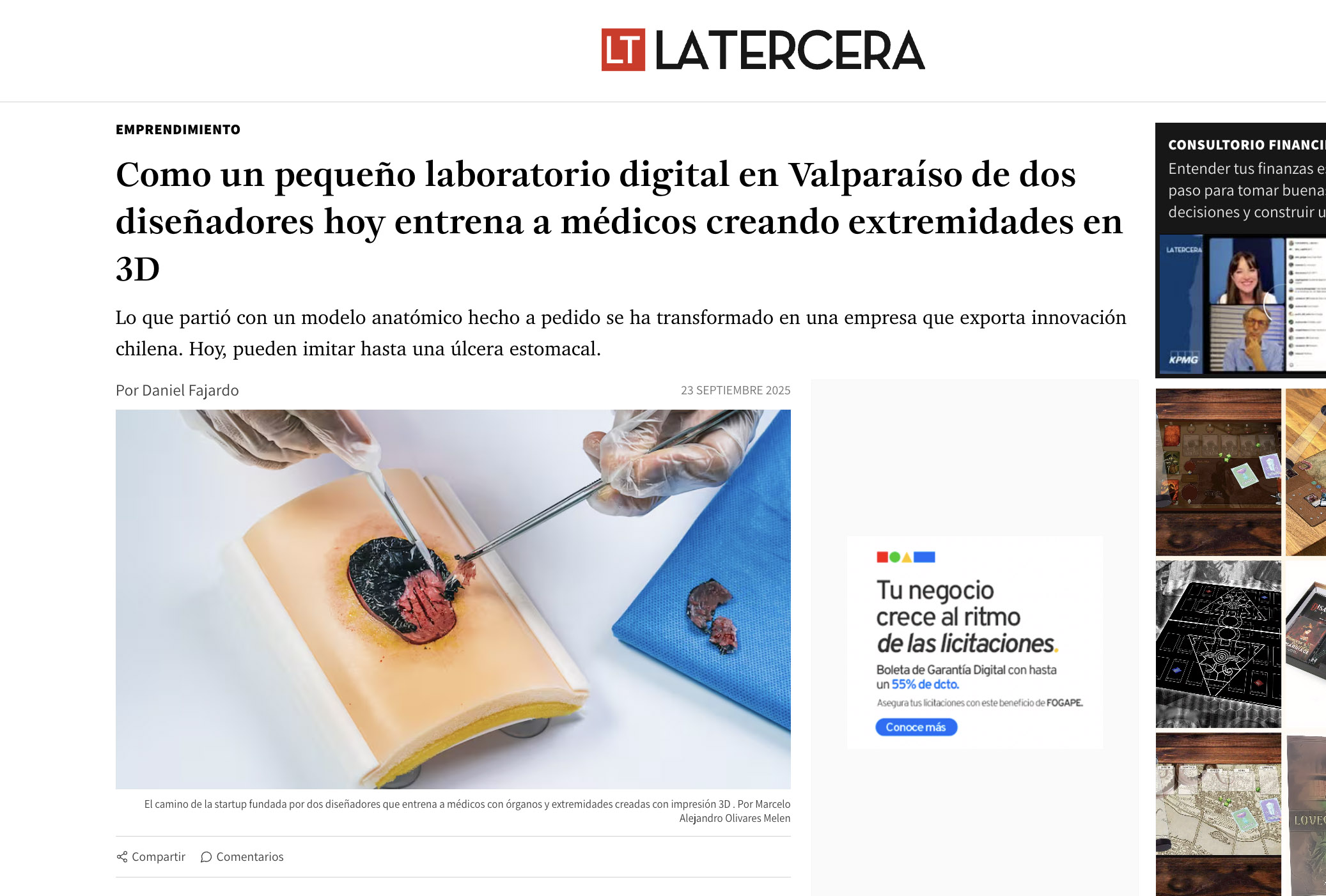 La Tercera abordó los orígenes de PLAN3D como un pequeño laboratorio digital fundado por dos diseñadores, que evolucionó hasta transformarse en una empresa que hoy produce extremidades, órganos y simuladores para prácticas clínicas mediante impresión 3D. El medio destaca su presencia en América y Europa, un catálogo de 26 productos y su impacto en la formación de profesionales de la salud.