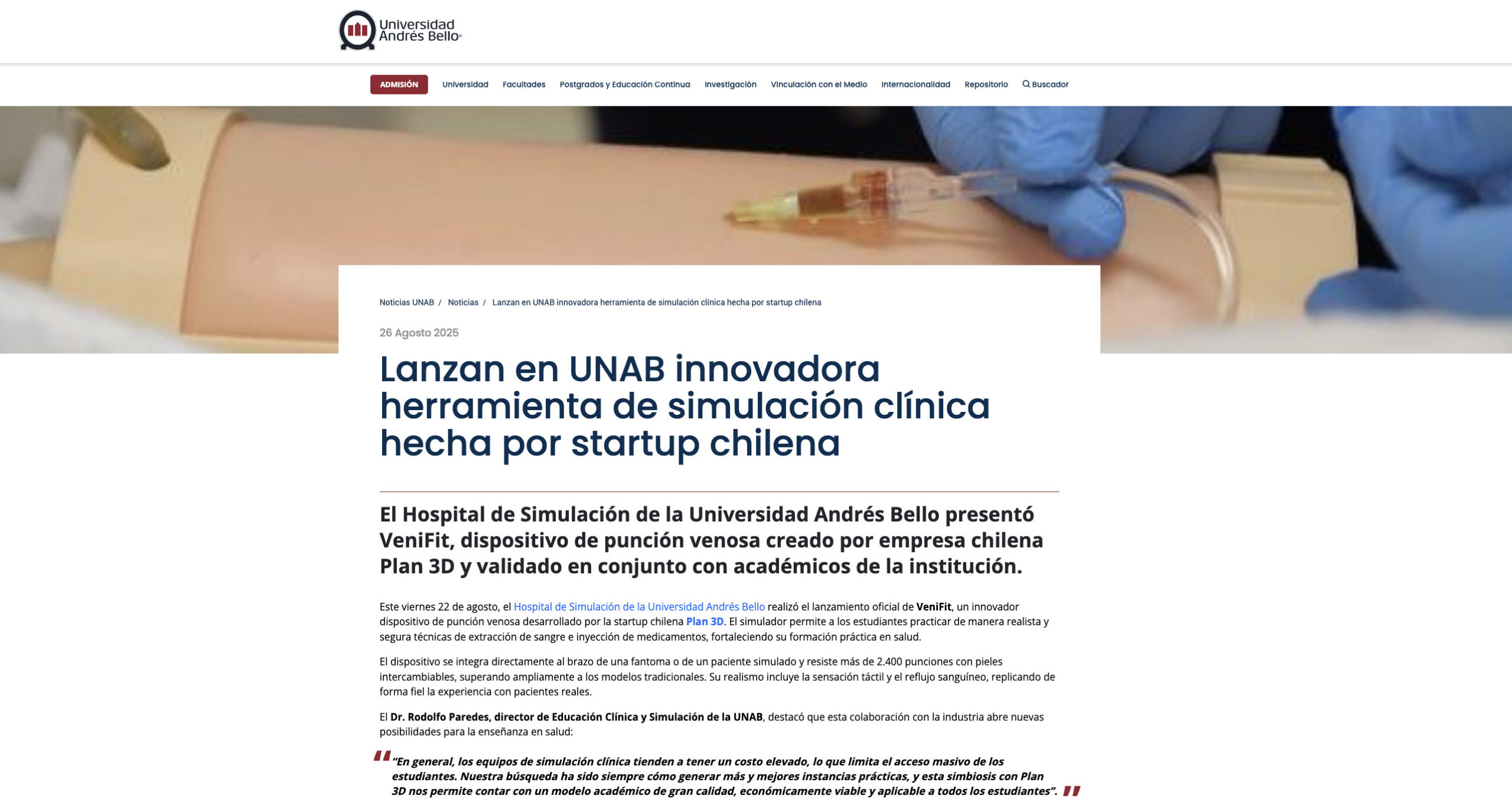 Desde Noticias UNAB, la nota “Lanzan en UNAB innovadora herramienta de simulación clínica hecha por startup chilena” valoró el trabajo conjunto entre la universidad y PLAN3D, destacando que VeniFit puede integrarse al brazo de un fantoma o paciente simulado, y que su diseño permite entrenamientos realistas y repetibles.