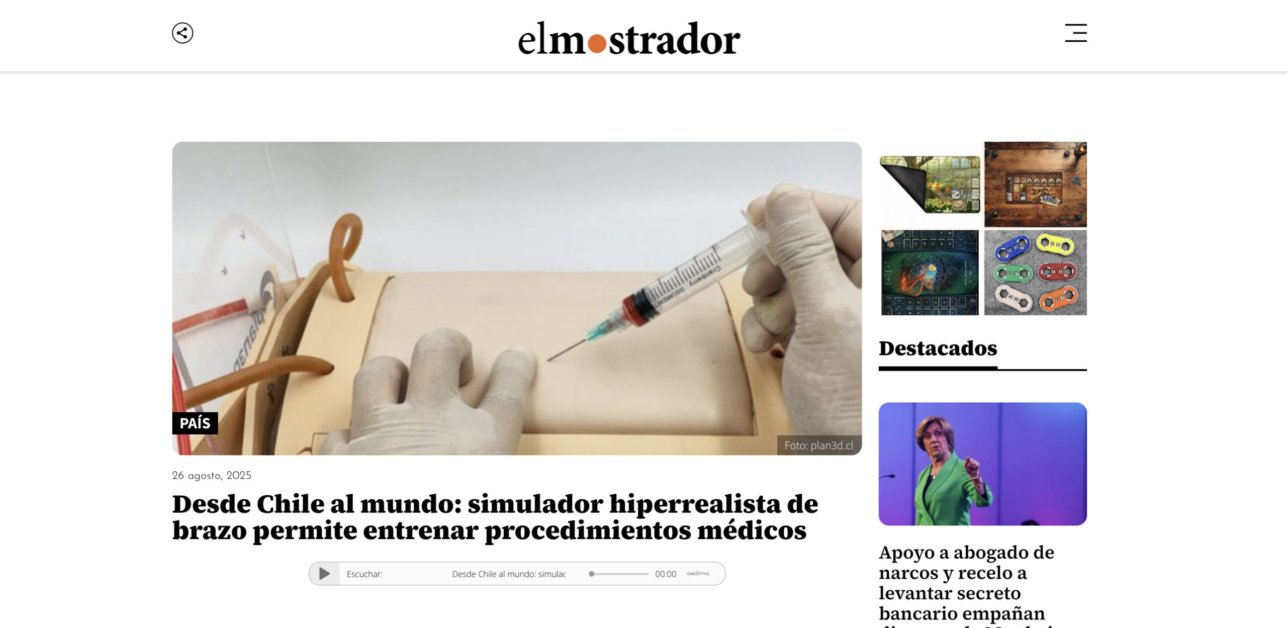 Por su parte, El Mostrador, en su artículo “Desde Chile al mundo: simulador hiperrealista de brazo permite entrenar procedimientos médicos”, destacó la precisión con que el dispositivo reproduce textura, grosor y flujo sanguíneo, considerándolo un hito en innovación chilena exhibido en la Expo Osaka 2025.