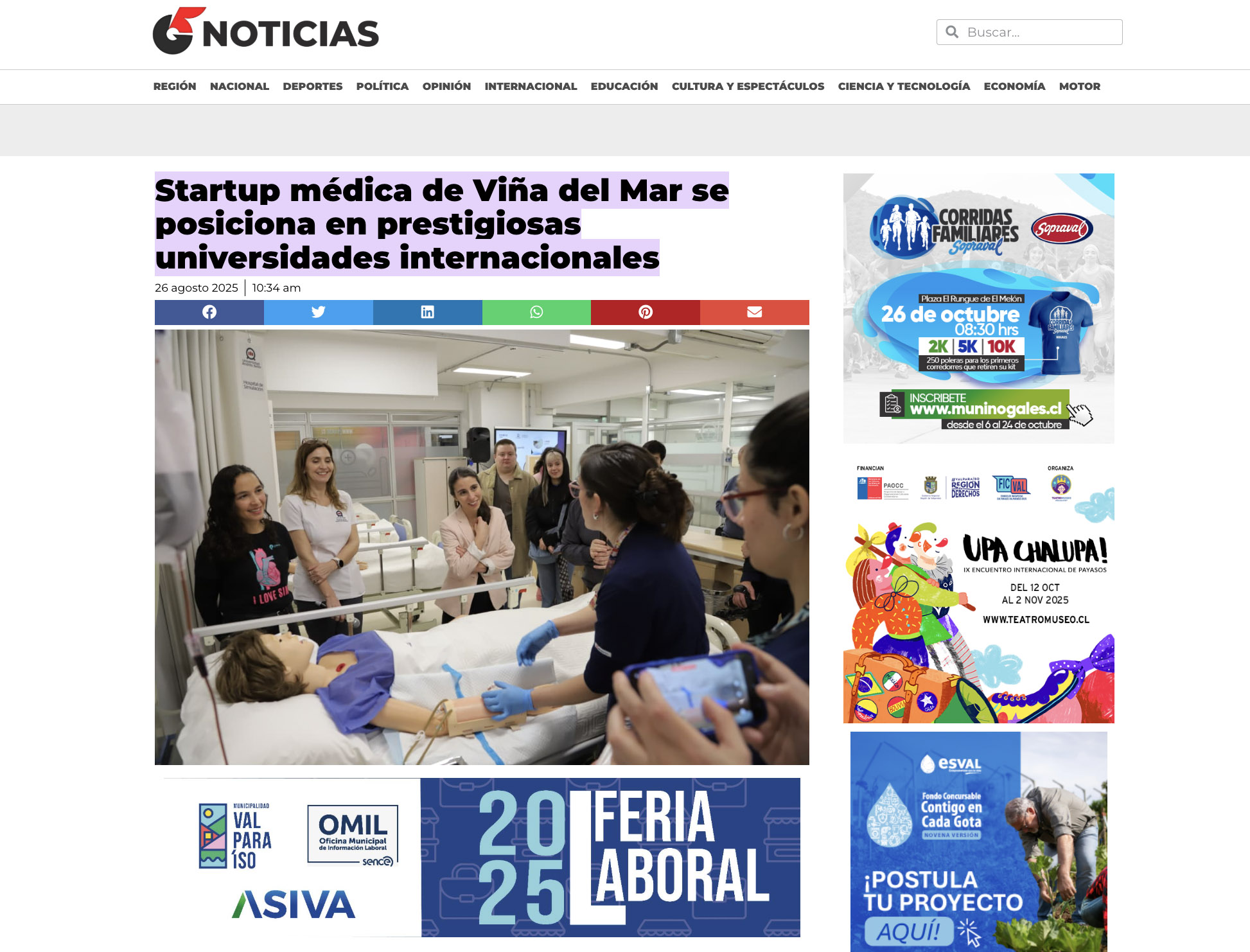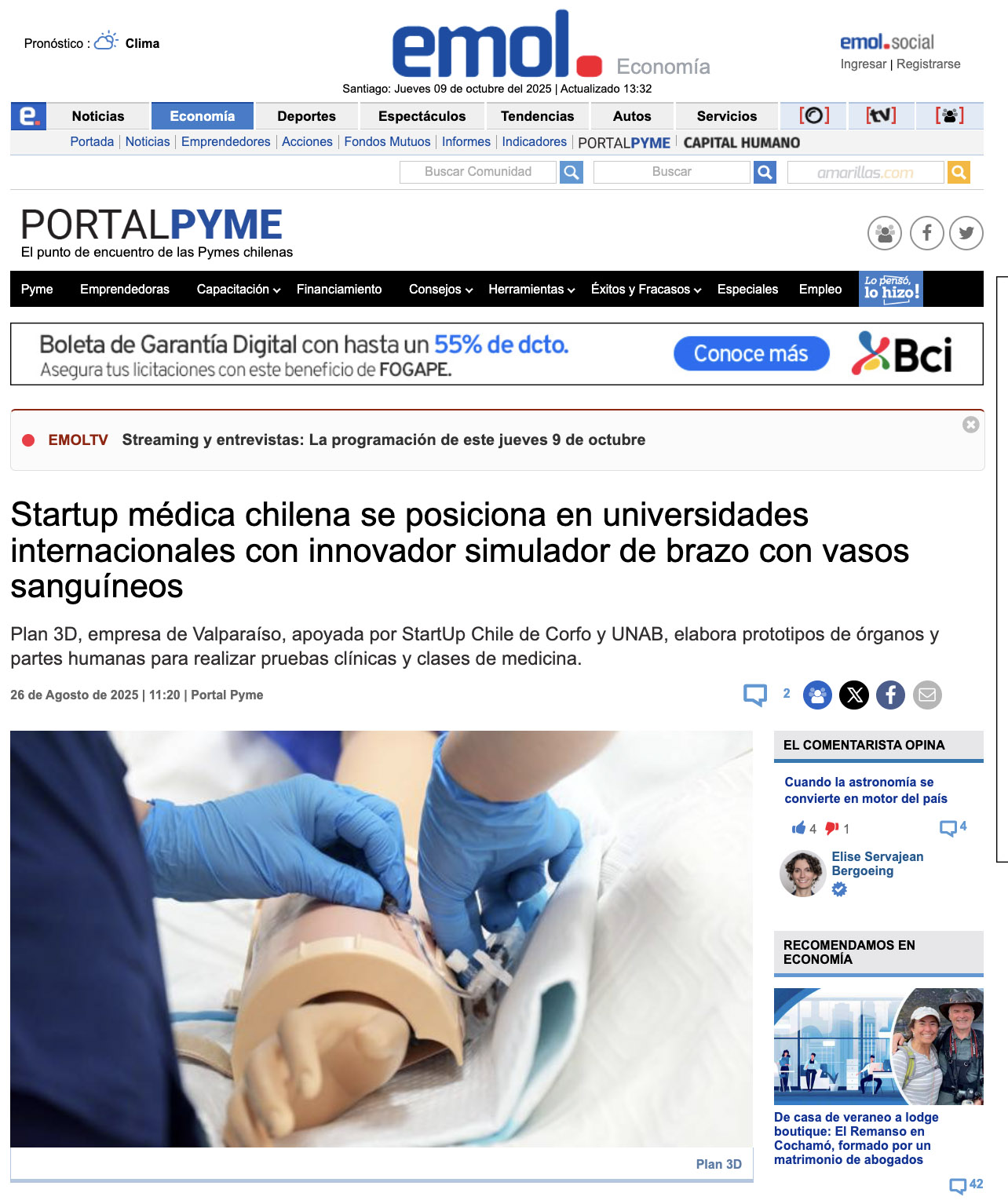 Emol (El Mercurio) resaltó el desarrollo de un simulador de brazo con vasos sanguíneos hiperrealistas, capaz de resistir más de 2.400 punciones y validado por el Hospital de Simulación de la Universidad Andrés Bello. La nota subraya la colaboración entre academia y emprendimiento, además de la expansión internacional hacia universidades como Columbia y la University of South Florida.