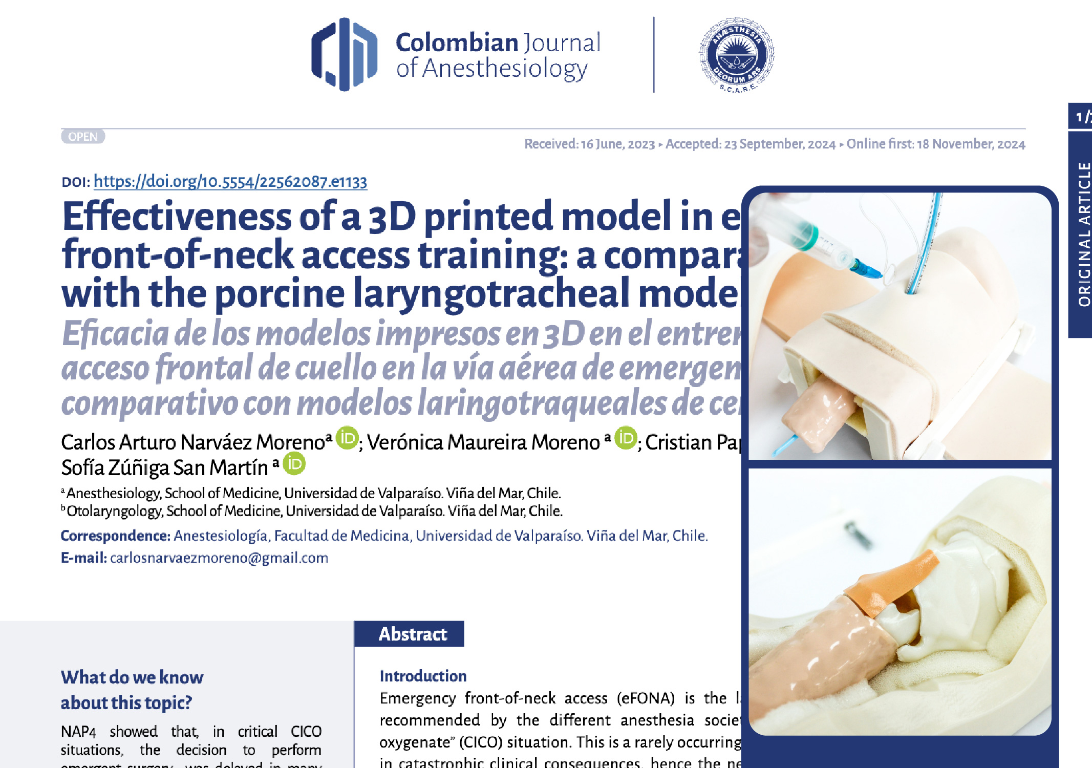 El entrenamiento en simulación clínica ha dado un nuevo salto gracias al uso de modelos de impresión 3D, y un reciente estudio lo confirma. La publicación, llevada a cabo por investigadores de la Universidad de Valparaíso, Chile, analiza las ventajas de un simulador 3D frente al modelo tradicional de aparato laringotraqueal de cerdo para la cricotiroidotomía quirúrgica, una técnica crítica en situaciones de emergencia. Este estudio ha sido publicado en la revista científica Colombian Journal of Anesthesiology.