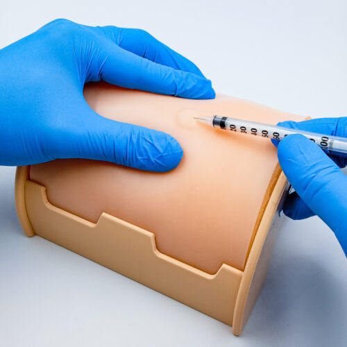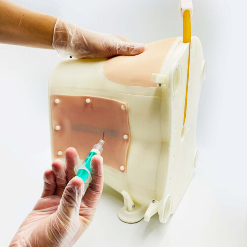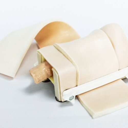 Tiene un sistema de sujeción, donde se fija y tensa la membrana que simula la piel. Así la laringe queda oculta y el practicante debe palpar la zona para reconocer dónde realizar la incisión. La membrana que simula la piel, es una lámina desechable, intercambiable y de bajo costo.